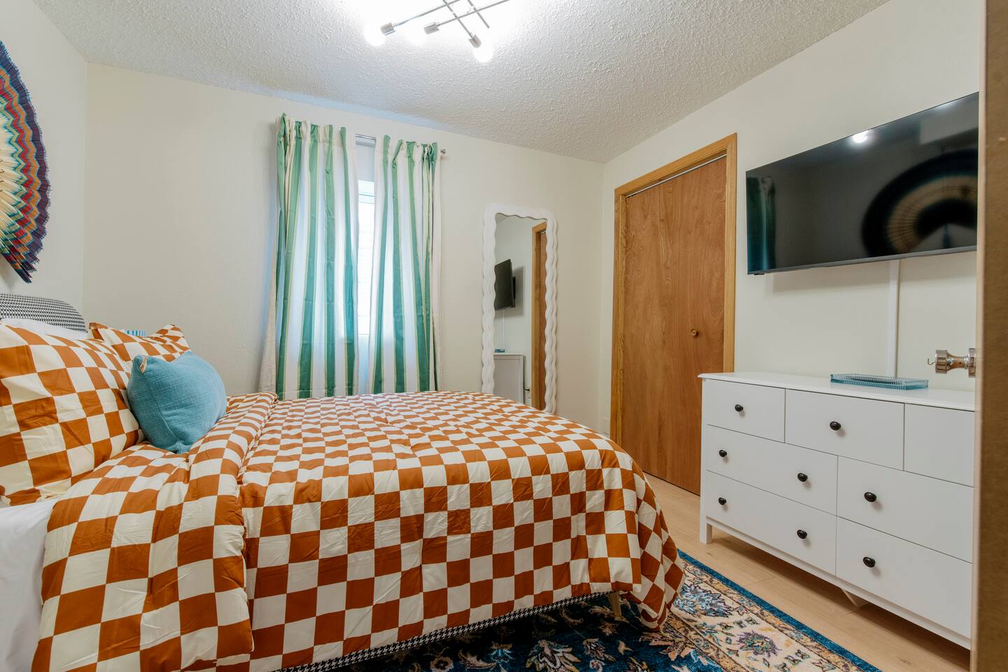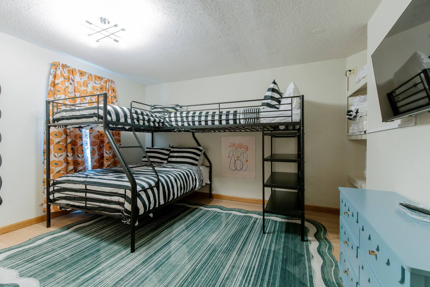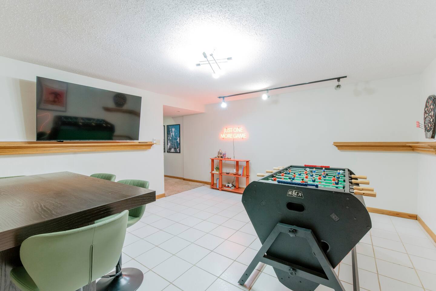 This spacious home features a modern eclectic design with all the modern updates and entertainment you need for an unforgettable stay. Spread out across six comfortable bedrooms, enjoy movie nights, golf tournaments, and evenings in the hot tub—all without leaving the house. 🛏 Sleeping Arrangements (Sleeps 14) 6 private bedrooms, each with its own TV Plenty of bed space for families, groups, or coworkers 🍽 Full Kitchen Fully stocked with dishes, cookware, and appliances—perfect for preparing meals for the whole group. 🎯 Entertainment Amenities Golf Simulator: Play almost any course in the world! Bring your own clubs or use our driver-friendly set. Private Sauna: Seats 4–5 people for the ultimate relaxation. Hot Tub: Fits 6–7 guests and is surrounded by a privacy fence for your comfort. Arcade Games: Retro games that are fun for all ages! 🛁 Bathrooms 3 full bathrooms with towels, shampoo, body wash, and hair dryers provided. 🖥 Other Features Smart TVs in every bedroom High-speed Wi-Fi Washer & Dryer Central heating and cooling Free parking on-site Self check-in